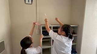 家庭科の学習で行った「クリーン大作戦」では、校内の汚れている箇所を探し、綺麗にする方法を考え、掃除を行いました。自作のお掃除グッズを片手に校内をピカピカにしてくれました。