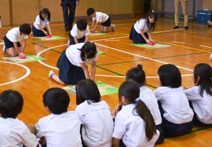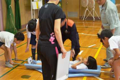 地域防災リーダー、区役所、消防署、PTAのみなさんにご協力いただき、全校児童で防災体験訓練を行いました。救急救命法や、担架作りを行ったり、災害時の水害映像視聴や液状化現象の模擬実験など体験し、とても有意義な活動ができました。