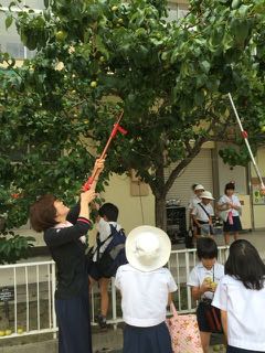 夏休みに登校していた児童と、栄養教諭、管理作業員が協力して、梨の実を高枝ばさみなど使って収穫しました。まだまだたくさん実があるので、成長を見ながら収穫していきます。