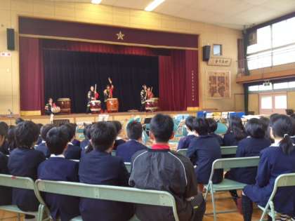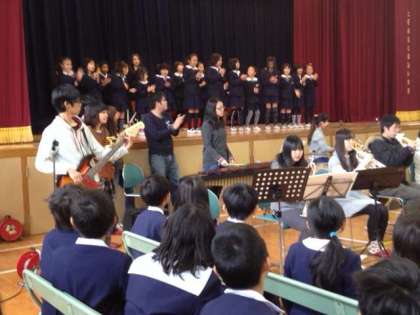本日、学校の裏にある大阪IT会計専門学校のみなさんに来校いただき、和太鼓の勇壮な演奏と、吹奏楽の美しいハーモニーを聞かせていただきました。
