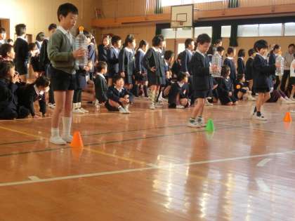 ペットボトルの飲み口に、ピンポン玉をのせて落とさないように運ぶというゲームです。なかよし班対抗で、みんな楽しんでゲームに参加していました。