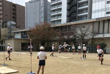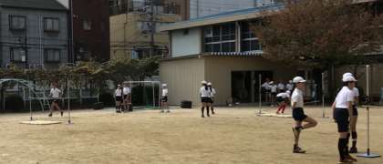 さわやかな秋晴れのもと、6年生が元気に、走り高跳びの学習をしています。
