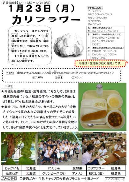 毎日食育通信:今週は「校庭の木々への感謝の集会」と「PTA給食試食会」があります。