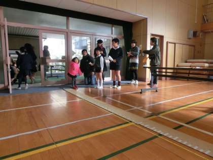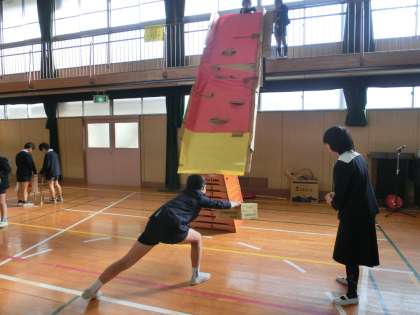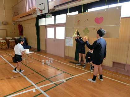 体育館でも、楽しいゲームがたくさんありました。紙飛行機を作って飛ばすゲームや、ストラックアウト、巨大なしかけで落ちてくるボールをキャッチするゲームなど工夫されていました。
