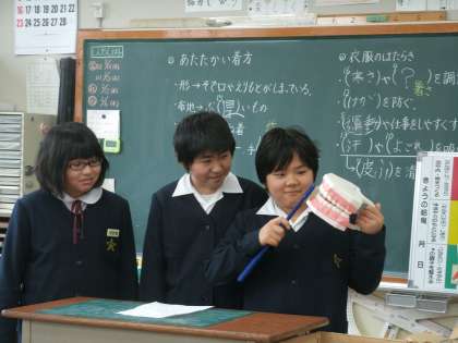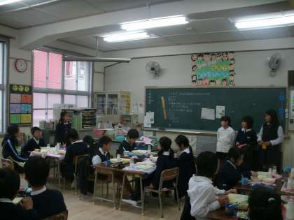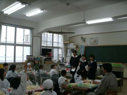 健康委員会の児童が、給食時に各学年をまわりかむかむチェックについて説明をしました。
