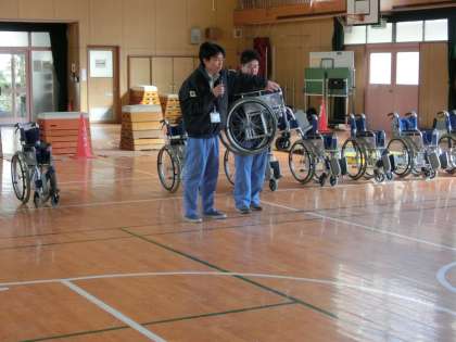 前半は講堂の中に設けられたコースを使って、自分で車いすに乗って操作する自走体験と友だちを車いすに乗せて介助する介助体験をしました。