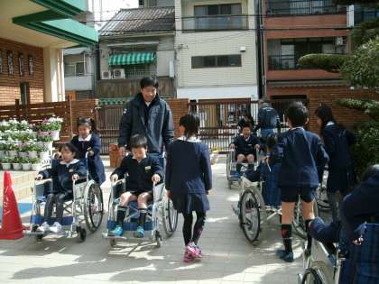 大阪市立心身障がい者リハビリテーションセンターの方に依頼し、3年生が車いす体験学習をしました。