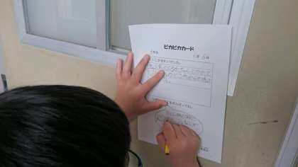 環境委員会が、掃除場所のチェックのためのピカピカカードを書いているところです。