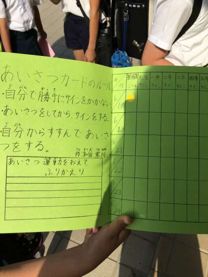 今日からあいさつ運動週間が始まりました。あいさつカードにシールを貼っているところです。