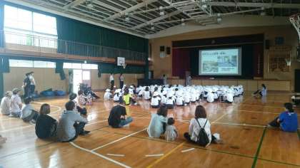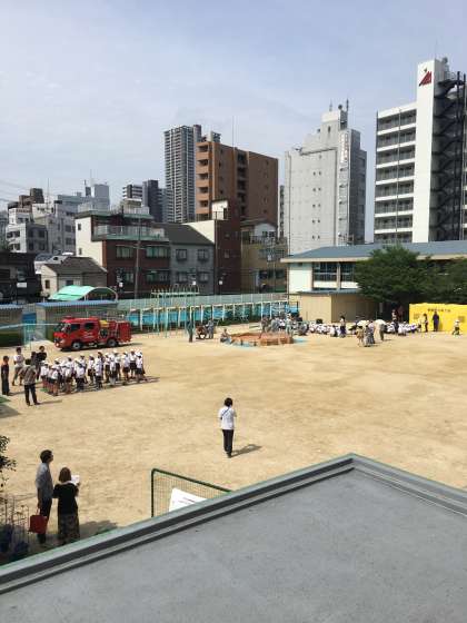 今日は土曜授業で防災体験訓練をしています。地域の防災担当の方々、消防署、区役所の方々にご協力、ご指導いただき、子どもたち、教職員、保護者が防災の意識を高める体験活動を行います。