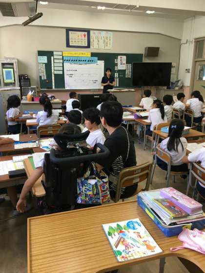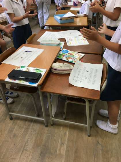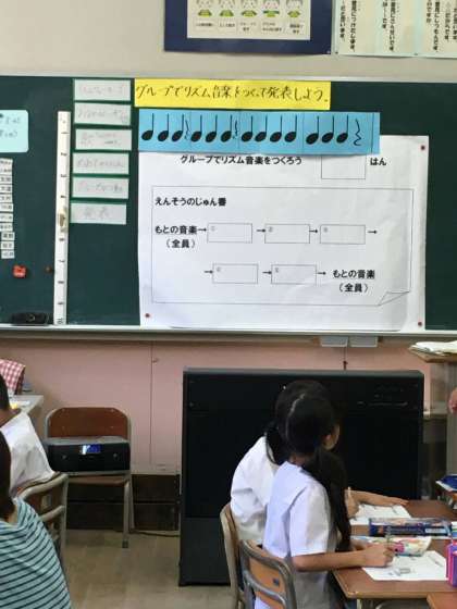 3年生の音楽の授業の様子です。グループでリズム音楽を作って、発表し合いました。友だちのグループの良かったところを見つけて発表し合いました。