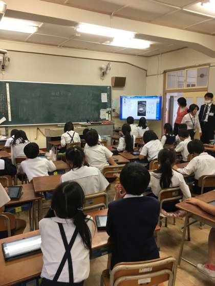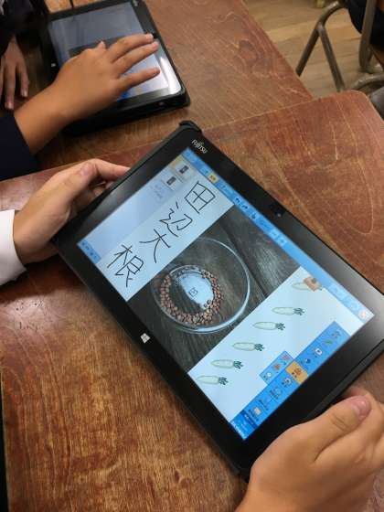 4年生はタブレットで作成した発表ノートを先生の画面に転送し、大型テレビに映し出された自分の発表ノートを見ながら、みんなの前で発表する学習をしました。