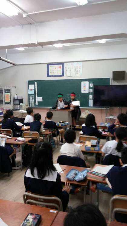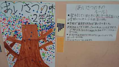 今週はあいさつ週間です。児童会の人が扮するあいさつマンが、各教室をまわり、あいさつのよさを伝えにいきました。