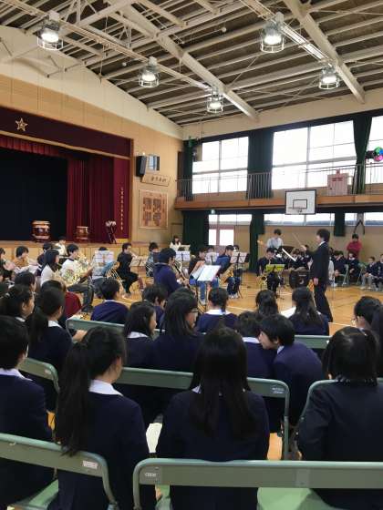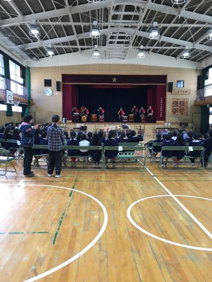 今日は近くにある専門学校のクラブメンバーが上福小学校の児童のために、演奏会を開いてくださいました。和太鼓と吹奏楽の演奏です。知ってる曲もたくさんあり、みんなで歌って盛り上がりました。