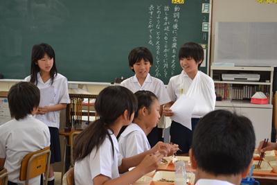 健康委員会の児童が各学級へ行き、「かむかむメニュー」を紹介します。今日のメニューは豚肉のごまみそ焼きでした。一緒に30回数えた後、感想を聞きました。