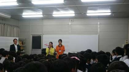 ゴールデンウイーク明けの月曜日ですが、あいにくの雨天のため、児童朝会を音楽室で行いました。課業中に子どもたちの安全を見守っていただいている区役所のフッピー隊の方々の紹介をしました。