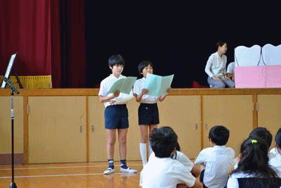 今週は、歯と口の健康強調週間です。給食中に、健康委員会のメンバーが各教室をまわっていますが、今日の集会では劇を通して、歯みがきの大切さをさらにアピールしました。