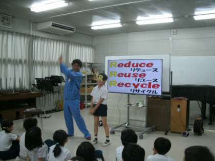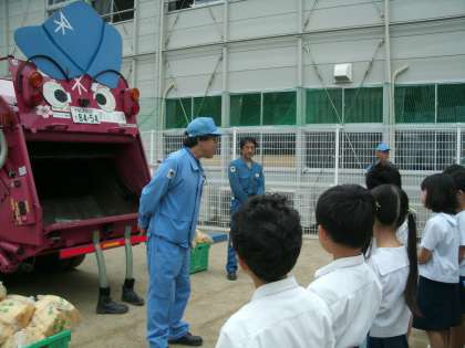 環境事業センターの方々が4年生のごみの学習のために、パッカー車に乗って学校に来てくださいました。ごみ処理について、わかりやすく楽しく教えてくださいました。