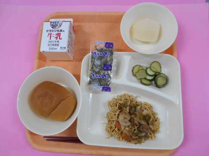 今日の給食は「焼きそば、きゅうりの甘酢づけ、なし(二十世紀)、黒糖パン1/2、牛乳」です。