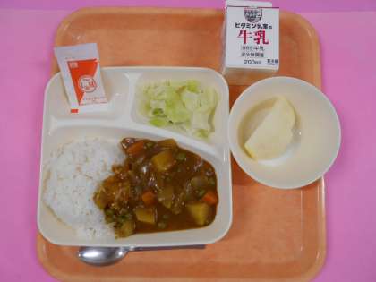 今日の献立は「ポークカレーライス(米粉)、キャベツのサラダ(ノンエッグドレッシング)、りんご、牛乳」です。