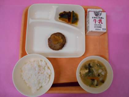 今日の献立は「和風おろしハンバーグ、みそ汁、かぼちゃのいとこ煮、ごはん、牛乳」です。