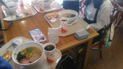 スクールメニューで好きなものを食べます。このグループは、仲良く全員ラーメンセットにしました。