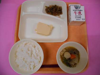 今日の主菜は卵どうふです。卵(液卵)に削り節でとっただしを加えて、みりん、塩、うす口しょうゆで味付けして、焼き物機で30分間蒸しました。