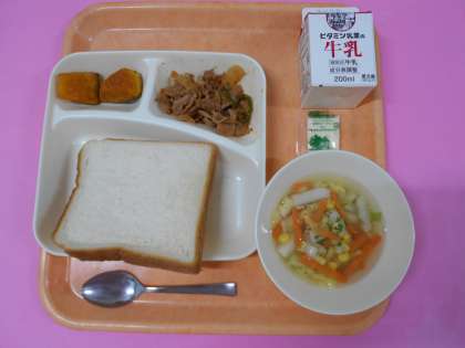 今日の献立は「豚肉のケチャップソテー、はくさいのスープ、焼きかぼちゃ、食パン、ソフトマーガリン、牛乳」です。