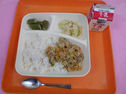 今日の給食は、他人丼、牛乳、ささみとキャベツのいためもの、オクラの甘酢あえです。