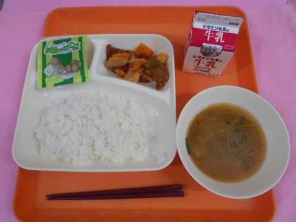 今日の給食は、ごはん、牛乳、酢豚、中華みそスープ、まっ茶大豆です。