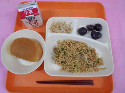 今日の給食は、ミニコッペパン、牛乳、オイスターソース焼きそば、もやしの中華あえ、ぶどう(巨峰)です。