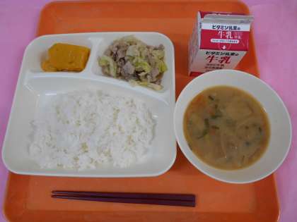 今日の給食は、ごはん、牛乳、豚肉と野菜のいためもの、いわしのつみれ汁、かぼちゃういろうです。