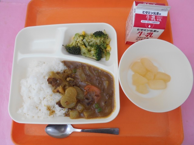 今日の給食は、冬野菜のカレーライス、牛乳、ブロッコリーとコーンのサラダ、和なし(缶)です。