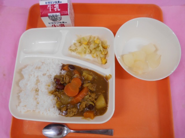 今日の給食は、豚肉と金時豆のカレーライスです。