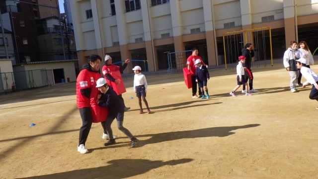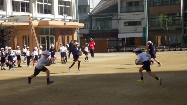 2時間目には4年生、3時間目には3年生がそれぞれ、ラグビーボールを渡していくリレーやボールを持って走るリレー、