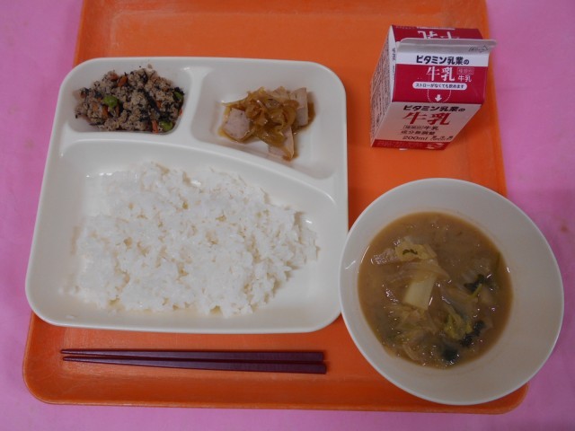 今日の給食は、ごはん、牛乳、まぐろのねぎじょうゆかけ、みそ汁、高野どうふのいり煮です。