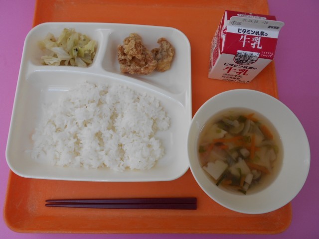 今日の給食は、ごはん、牛乳、鶏肉のたつたあげ、五目汁、キャベツの梅風味です。