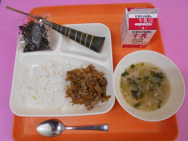 今日の給食は、きんぴらちらし(きざみのり)、牛乳、五目汁、ちまき(小麦)です。