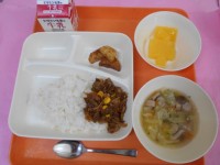 今日の給食は、ビーフケチャップライス、牛乳、フライドポテト、キャベツのスープ、ダ...