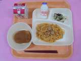今日の給食は、黒糖パン(1/2)、牛乳、チキントマトスパゲッティ、キャベツのひじ...