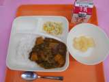 今日の給食は、鶏肉と一口がんもに煮ものです。