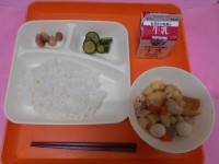 今日の給食は、ごはん、牛乳、豚肉と干しずいきのみそ煮、五目汁、焼きじゃがです。今週は、歯と口の健康強調週間です。給食で毎日1品かむかむメニューを決めて一口30回かんでいます。今日のかむかむメニューは、...