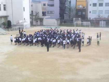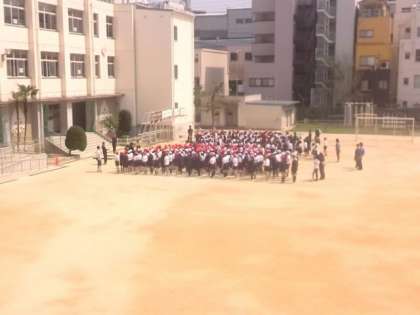 午前中に火事を想定した避難訓練が行われ、子どもたちは「お(おさない)、は(走らない)、し(しゃべらない)、も(戻らない)」の約束を守って、全員が4分間で運動場に避難し、校長先生のお話を聞きました。