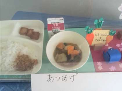 給食は今日から1年生も自分たちで運搬し、手作りのふりかけ「べにざけそぼろ」をたくさんおかわりして残さずに食べました。ネコの形のラッキーにんじんが入った「鶏肉とじゃがいもの煮もの」や甘辛い味付けでご飯がすすむ「あつあげのしょうゆだれかけ」も大人気でした。明日は煮込みハンバーグ等のパン献立です。