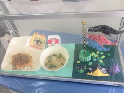 今日は1年生がはじめての遠足に行きました。「楽しかったよ、お弁当がおいしかったよ、ただいま、帰りました」と元気な子どもたち。中には疲れてぐったりしている児童もいました。給食メニューは、野菜がたっぷりでおいしい「ビビンバ」でした。給食室前のディスプレイが、かわいい子どもの日バージョンになっていました。