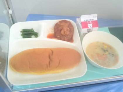 今週は煮込みハンバーグの日のスープに、チョウの形のラッキーにんじんが入っていました。ふかふかのパンプキンパンもおいしくて児童に人気がありました。