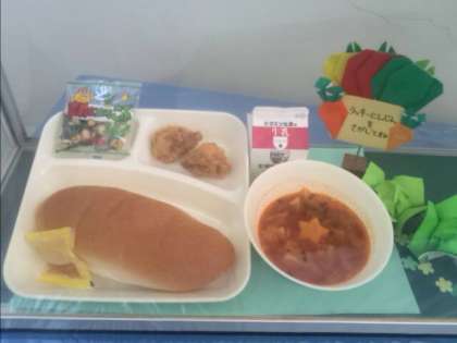 今日は豚肉にパン粉や衣をつけて一つ一つ揚げた手作りの「一口トンカツ」とトマトの風味がたっぷりの「ミネストローネ」などのパンメニューでした。このメニューは、平成28年度、大阪市とイタリア、ミラノとの姉妹都市提携35周年記念メニュー「ミラノ風カツレツ、ミネストローネなど」の献立をアレンジしたものです。星の形のラッキーにんじんが、ミネストローネに入っていました。
