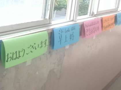 「早上好(ざおしゃんはお)」「あんにょんはしむにか」などあいさつを書いた画用紙をめくると、「中国」「韓国・朝鮮」など国の名前が出てくるように工夫され、子どもたちは楽しんでめくってあいさつの言葉を覚えています。世界地図も掲示され、あいさつの言葉がある画用紙の色と国の色が同じになっていますので、よく見て学びましょう。
