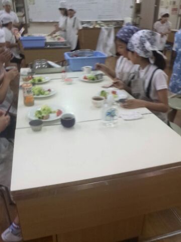 5年生の児童が、調理実習で「ゆで野菜のサラダ」を調理しました。それぞれ家庭から好きなドレッシングを持参し、調理したサラダにかけて食べました。中にははじめて包丁を使い野菜を切る貴重な経験をした児童もあって、どちらのクラスも大きなケガなくホッとしました。調理のあとに「自分たちで作ったサラダはおいしくて、家では野菜のサラダを進んで食べないけど、今日はとってもおいしかったです。」「キャベツやブロッコリーの芯がおいしいとはじめて知りました。」など感想を発表しました。