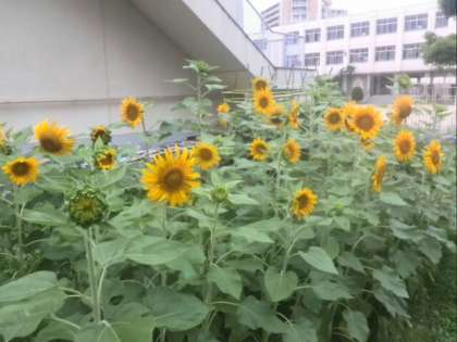 学習園ではアサガオやヒマワリの花が満開で、夏本番です。アサガオはたくさん花が咲いたので、1年生の生活科の授業で色水づくりの活動に使っています。